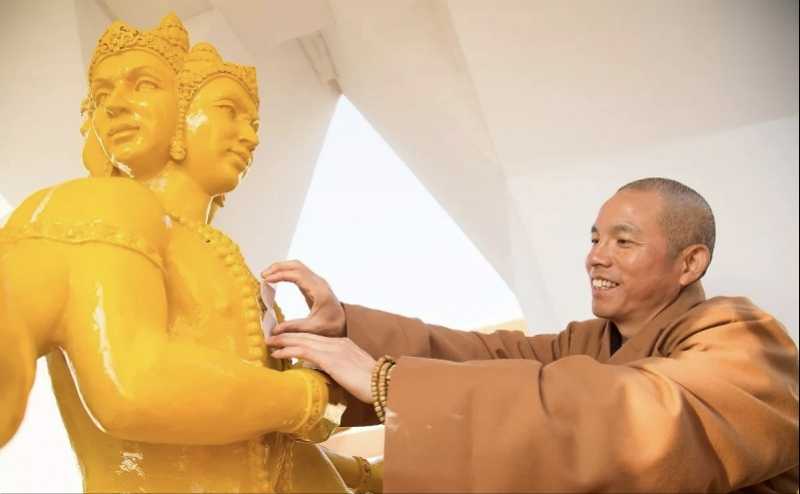 印乐法师为泰国风格佛殿内的四面佛进行贴金。