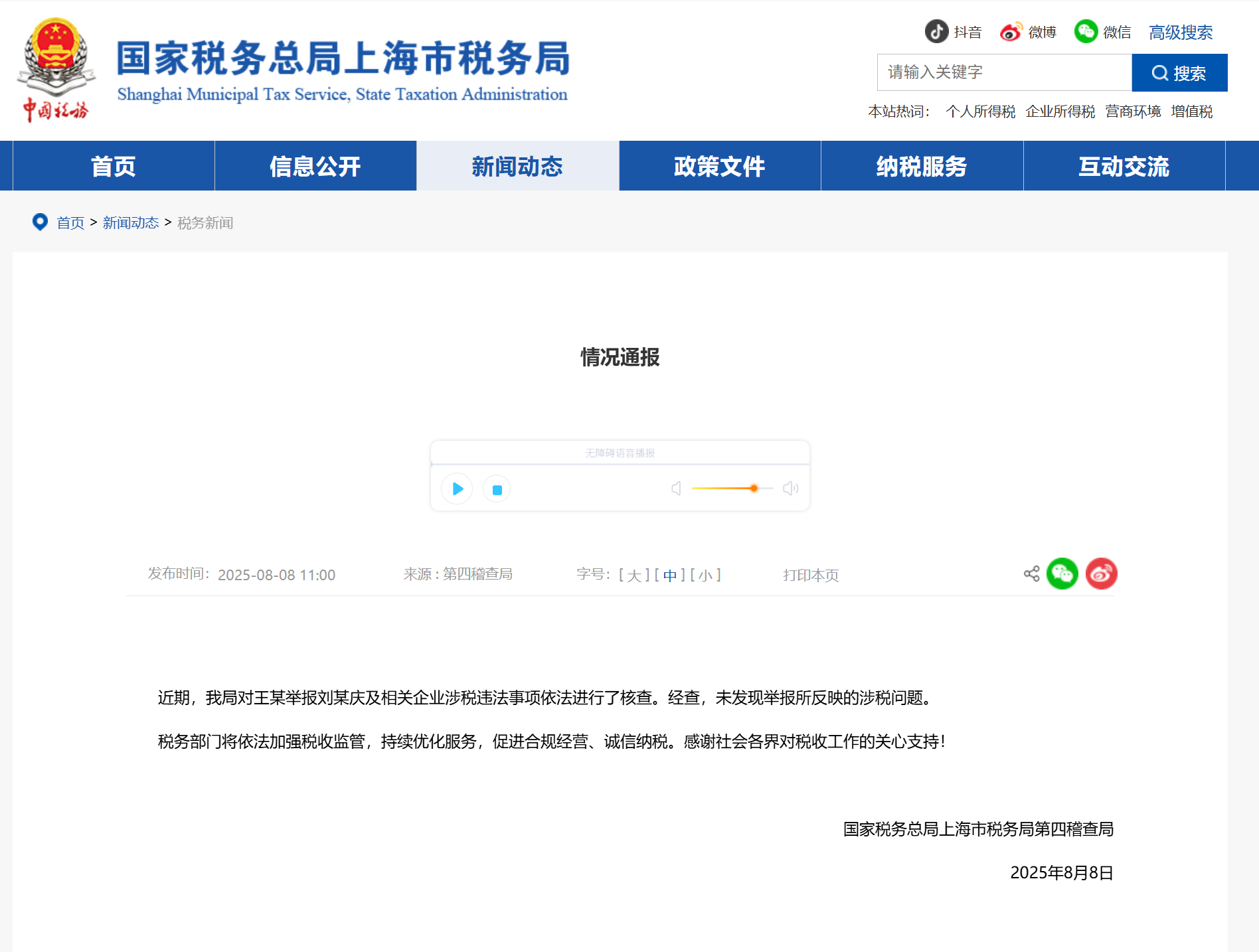 国家税务总局上海市税务局第四稽查局对王某举报刘某庆及相关企业涉税违法事项进行核查,经查未发现举报所反映的涉税问题,并及时公布情况通报。
