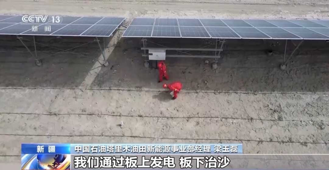 中国石油塔里木油田新能源事业部经理梁玉磊:我们通过板上发电、板下治沙,建设光伏方阵32个,固沙面积达到4000亩。有效改变了小环境风速,形成“发电-固沙-惠民”一体模式。