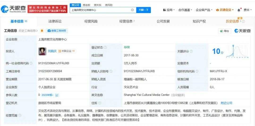天眼查显示,刘晓庆名下关联10家企业,7家为吊注销状态,仅3家公司存续,行业均涉及文化、体育和娱乐业。其担任被指控的上海弈熙文化传媒中心投资人角色,该公司为个人独资企业,成立于2017年6月,出资额3万元。