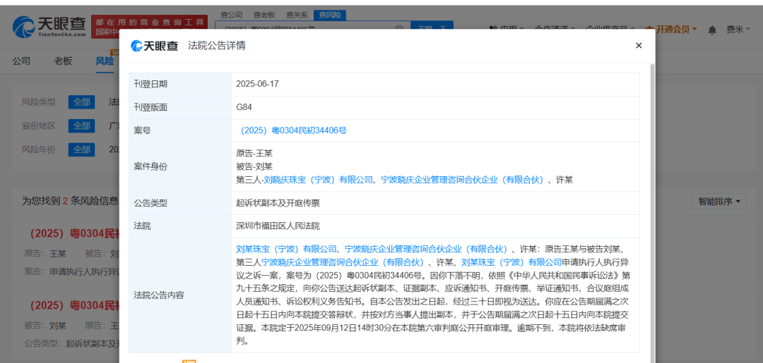 天眼查显示,深圳市福田区人民法院向宁波晓庆企业管理咨询合伙企业(有限合伙)、许某、刘晓庆珠宝(宁波)有限公司公告送达王某与刘晓庆等申请执行人执行异议之诉一案起诉状副本及证据副本、应诉通知书、开庭传票等,自公告之日起30日即视为送达,并定于9月12日开庭审理。