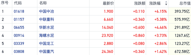 截至发稿,中国中冶(01618.HK)涨逾6%,中联重科(01157.HK)涨超5%。此外,海螺水泥(00914.HK)等多家细分行业龙头也跟涨3%以上,市场表现活跃。