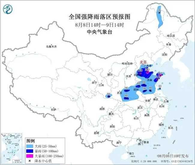 中央气象台8月8日发布暴雨黄色预警。预计,8日8时至9日8时,内蒙古东北部、黑龙江西北部、河北中南部、北京西部和南部、天津、山东中西部、河南北部和西部、安徽北部、江苏西北部、甘肃南部、陕西东南部、西藏东南部等地部分地区有大到暴雨,其中,河北中南部、山东北部等地部分地区有大暴雨。交通运输部启动强降雨三级防御响应。