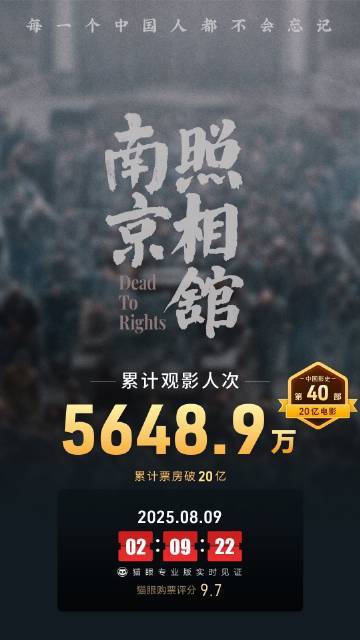 据猫眼专业版最新数据,电影《南京照相馆》自上映以来,持续受到观众热捧。上映仅16天,截至8月9日2时9分,其总票房已强势突破20亿大关,彰显了影片的非凡魅力与市场号召力。
