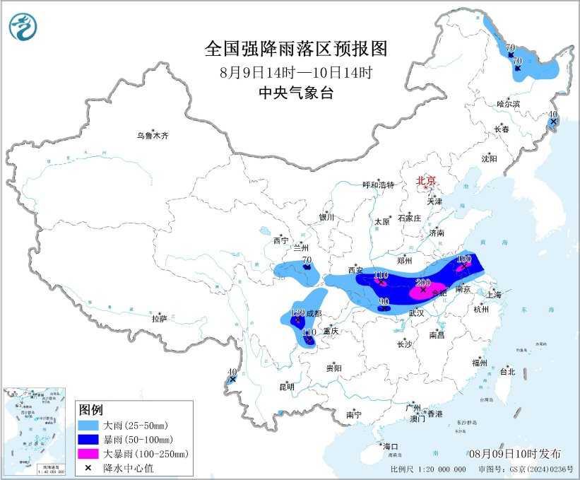 预计,8月9日14时至10日14时,黑龙江北部、甘肃东南部、四川盆地中西部、云南西部和南部、陕西南部、重庆北部、河南南部、湖北大部、安徽中北部、江苏中北部等地部分地区有大到暴雨,其中,四川盆地西部和南部、河南西南部和东南部、湖北西北部和东北部、安徽西部、江苏西部等地部分地区有大暴雨(100~200毫米)。上述部分地区伴有短时强降水(最大小时降雨量20~50毫米,局地可超过80毫米),局地有雷暴大风等强对流天气。