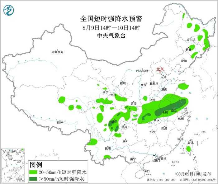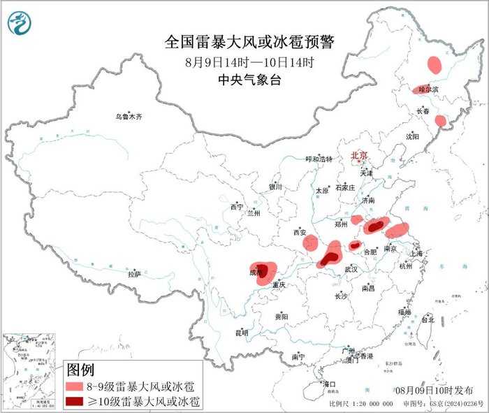 预计8月9日14时至10日14时,东北地区中东部、黄淮南部、江淮北部、江汉中西部、西南地区东部等地的部分地区将有8级以上雷暴大风或冰雹天气,其中,河南南部、安徽东北部、江苏西北部、湖北中部、四川盆地中西部等地的部分地区将有10级以上雷暴大风,最大风力可达11级以上;东北地区中东部、黄淮南部、江淮大部、江汉大部、西南地区东部、西北地区东南部等地的部分地区将有小时雨量大于20毫米的短时强降水天气,其中,陕西南部、河南南部、安徽中部、江苏中部、湖北中西部、四川盆地西部和东南部等地的部分地区小时雨量大于50毫米,最大可达80毫米以上。