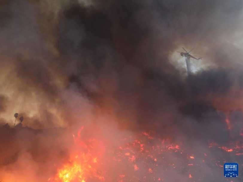 8月7日,在美国加利福尼亚州文图拉县,消防直升机在山火现场洒水灭火,全力应对快速蔓延的山火。