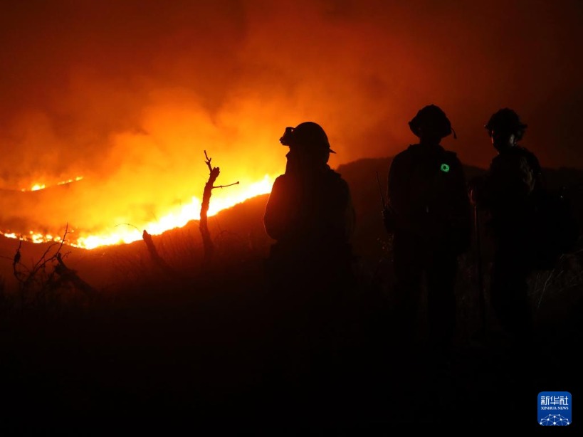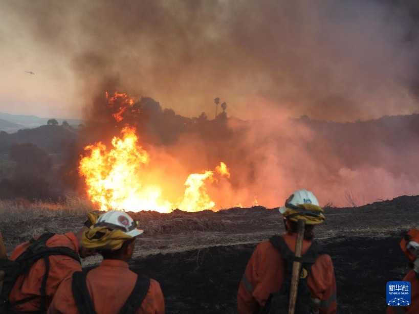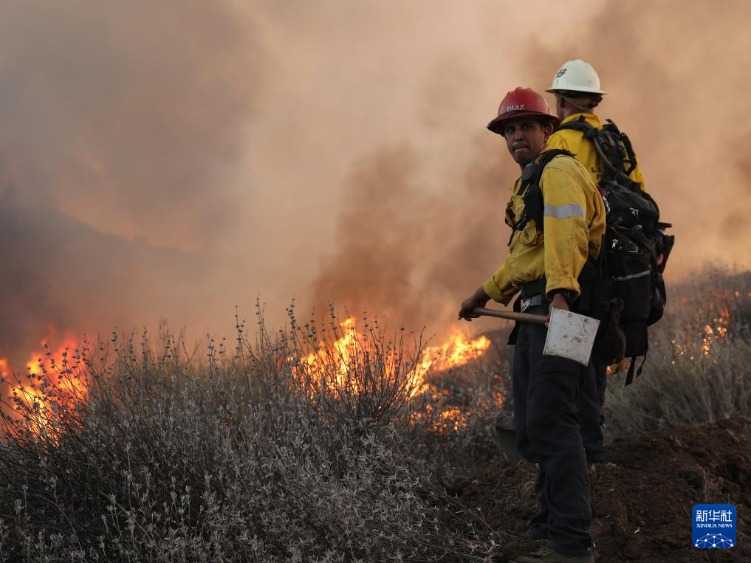 8月7日,在美国加利福尼亚州文图拉县,消防员在山火现场密切观察火情,为灭火行动提供关键信息。