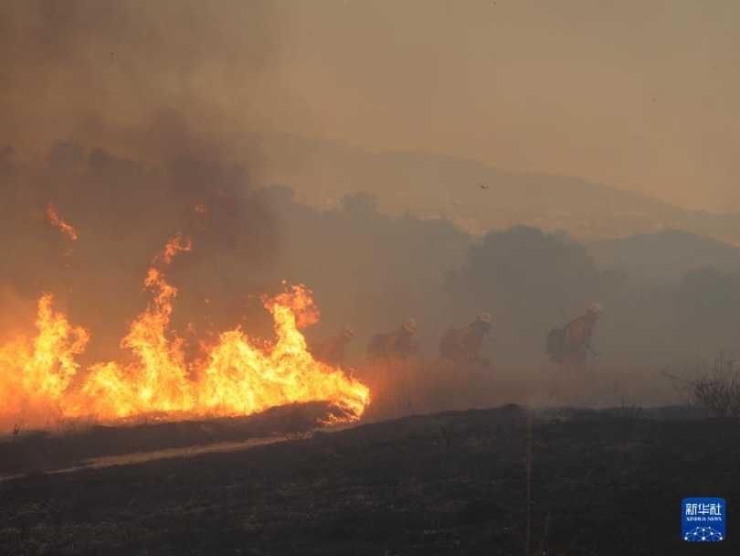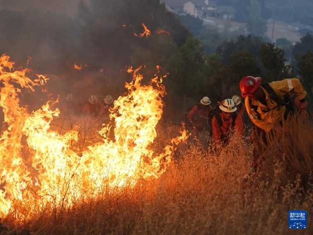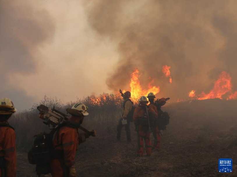 8月7日,在美国加利福尼亚州文图拉县,消防员在山火现场紧张作业,努力控制火势。