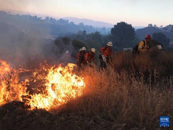 8月7日,在美国加利福尼亚州文图拉县,消防员在山火现场作业,全力阻止山火进一步扩散。
