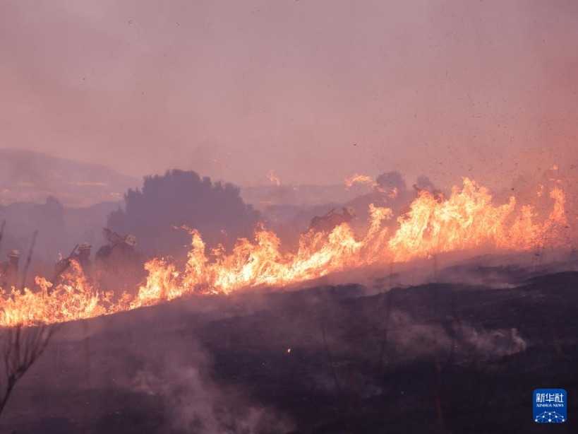 8月7日,在美国加利福尼亚州文图拉县,消防员在山火现场作业,与山火展开殊死较量。