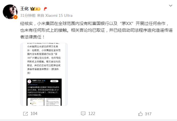8月8日,针对网传“雷军通过富国银行茅XX向海外转出50亿美金”这一不实言论,小米集团公关部总经理王化迅速发文辟谣。他明确表示,经详细核实,小米集团在全球业务布局中,从未与富国银行以及所谓的“茅XX”有过任何形式的合作或接触。对于此类毫无根据的谣言,小米集团已全面取证,并果断启动司法程序,坚决追究造谣传谣者的法律责任,以维护企业声誉和合法权益。