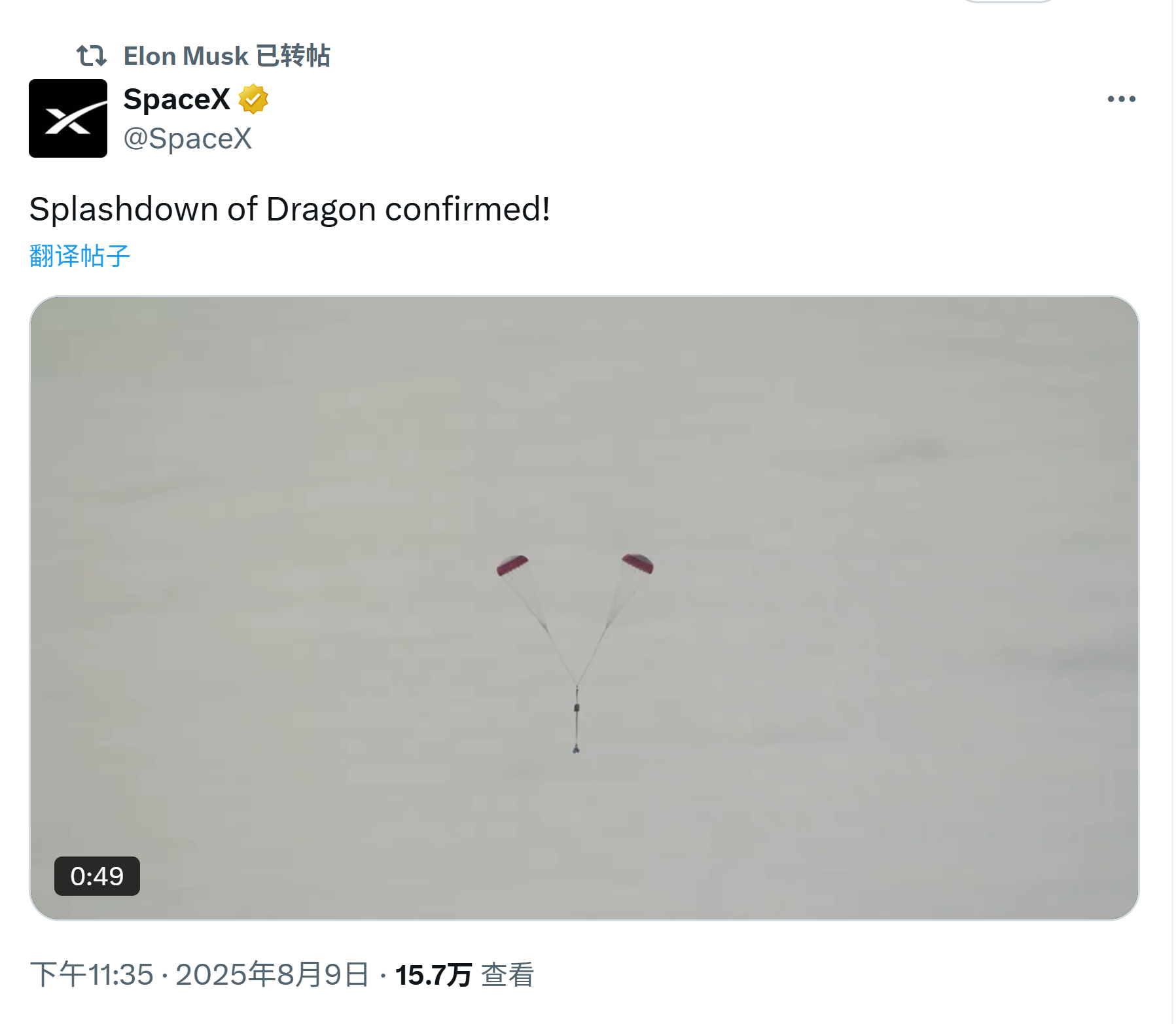 每经AI快讯,当地时间8月9日,SpaceX在社交媒体上发文称,已确认Dragon飞船成功溅落!执行Crew-10任务的宇航员已安全返回地球。此次Dragon飞船的溅落,标志着SpaceX在载人航天领域又迈出了重要一步,展现了其在商业航天领域的强大实力。