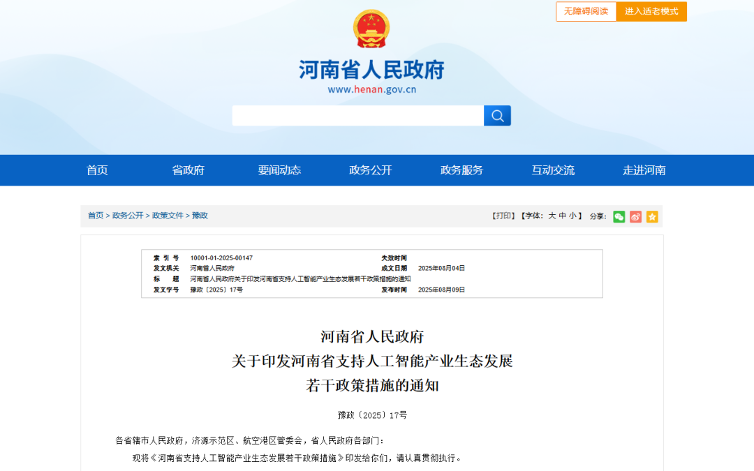 河南发布《河南省支持人工智能产业生态发展若干政策措施》,提出设立产业基金、推进关键技术攻关、加强模型研发应用等10条举措,推动人工智能科技创新与产业创新深度融合,打造人工智能发展新高地。
