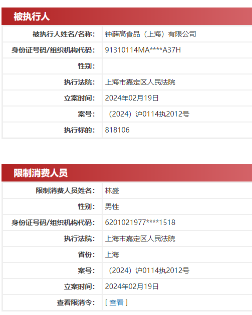 近日,昔日明星雪糕品牌“钟薛高”及公司实际控制人林盛被限制高消费。根据中国执行信息公开网消息,3月11日,上海市嘉定区人民法院对钟薛高食品(上海)有限公司及其法定代表人林盛发布了限制消费令,原因是“未按执行通知书指定的期间履行生效法律文书确定的给付义务”,涉及执行标的合计81.81万元。