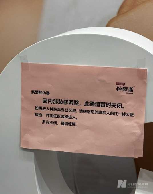 3月12日下午,钟薛高总部正门被临时封闭,一块约3米长的宣传物料遮挡了入口,上面贴着一张粉色纸张,公司方面回应称此举是因“内部装修调整”。然而,记者通过侧门观察发现,办公室内灯光通明,人员正常走动,未见明显装修迹象。
