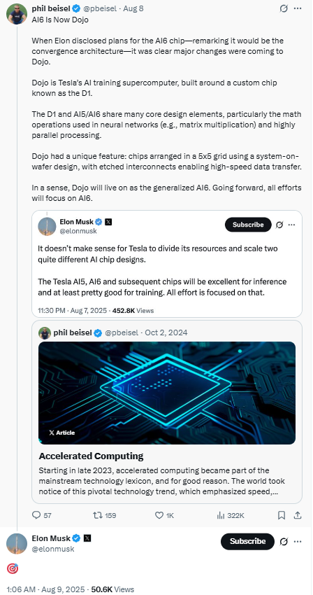 Rivian的高级总监Phil Beisel在一则评论中指出,Dojo有一个特点,即芯片采用晶圆系统设计,排列成5×5的网格,并采用蚀刻互连技术实现高速数据传输。从某种意义上说,Dojo将作为广义的AI6继续存在。未来,特斯拉所有努力都将集中在AI6上。
