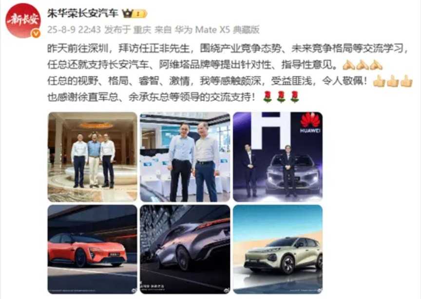 8月9日晚,长安汽车董事长朱华荣微博发文,称周五前往深圳拜访华为CEO任正非,围绕产业竞争态势、未来竞争格局等交流学习。
