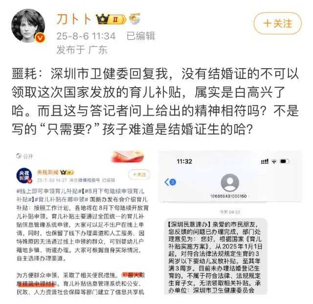 但工作人员同时强调,具体实施细则需等待广东省统一部署:“目前答复是依据现行法规作出的,但最终是否需要结婚证明,要以8月底上线的全省统一育儿补贴申报系统要求为准。”