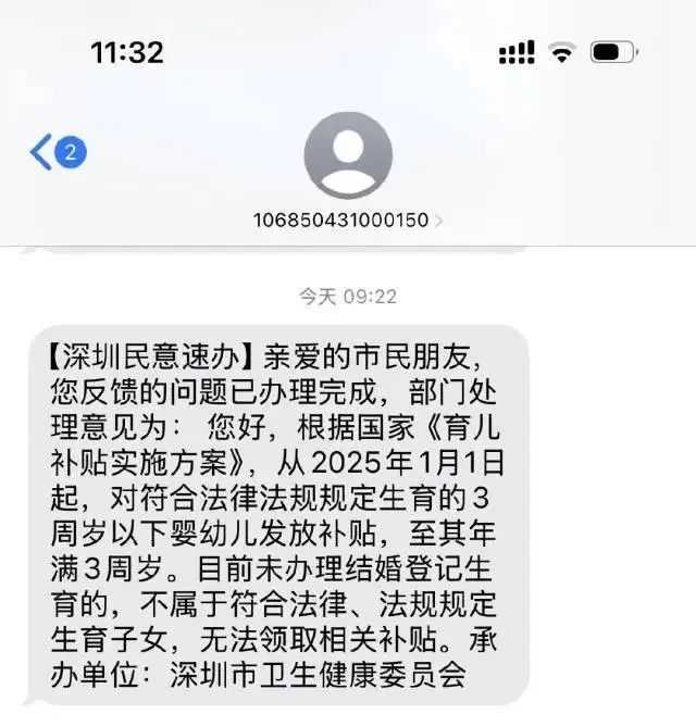 据南方+8月8日报道,8月6日,有网友发文反映称,自己收到深圳卫生健康委短信告知,因其未办理结婚登记生育,不属于符合法律、法规规定生育子女,无法领取相关育儿补贴,相关贴文立即引起网友热议。