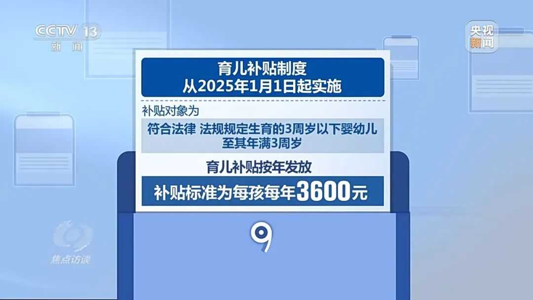 根据《育儿补贴制度实施方案》,育儿补贴制度从2025年1月1日起实施,补贴对象为符合法律、法规规定生育的3周岁以下婴幼儿,至其年满3周岁。育儿补贴按年发放,补贴标准为每孩每年3600元。