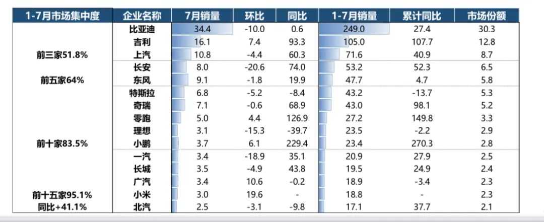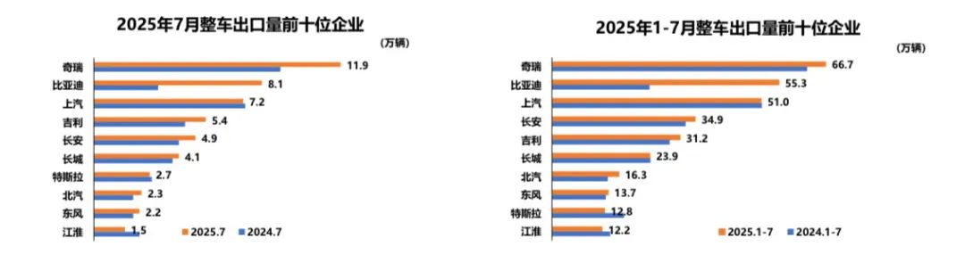 在新能源汽车业务方面,1—7月,新能源汽车销量排名前十五位的企业集团销量合计为782万辆,同比增长41.1%,占新能源汽车销售总量的95.1%。在出口业务方面,1—7月,整车出口前十企业中,奇瑞出口量达66.7万辆,比亚迪出口增速最为显著,出口达55.3万辆,同比增长超过130%。