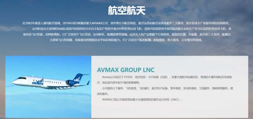据公司官网,山河智能在2002年就进入通用航空领域,2016年成功收购加拿大AVMAX公司,业务细分为航空制造、航空运营和航空运营商服务三大板块,初步形成全产业链布局的发展格局。
