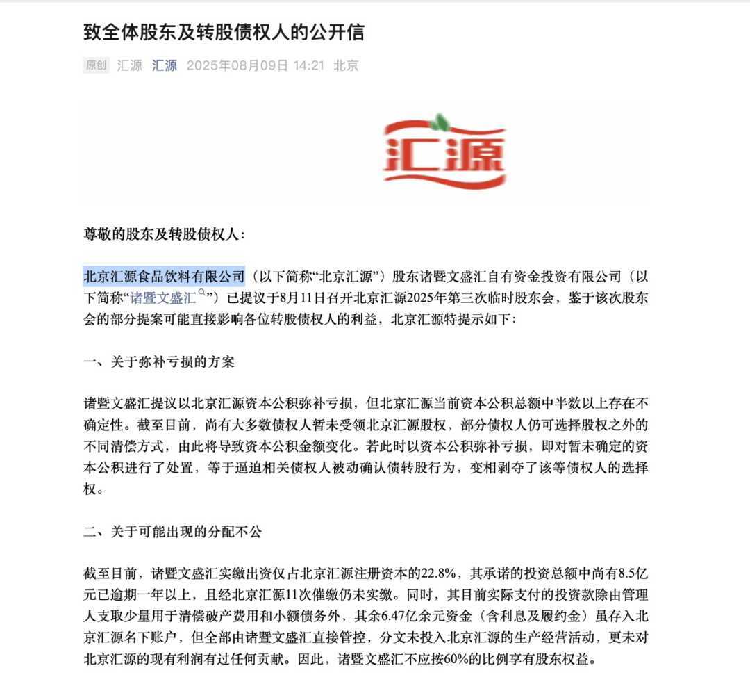8月9日周六下午,北京汇源食品饮料有限公司(下称“汇源果汁”)官微发布一封《致全体股东及转股债权人的公开信》。