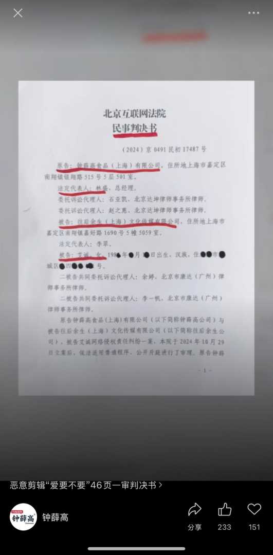 红星资本局8月12日消息,红星资本局从钟薛高创始人林盛处获悉,钟薛高起诉“爱要不要”视频争议官司一审判决在7月下旬已出炉。