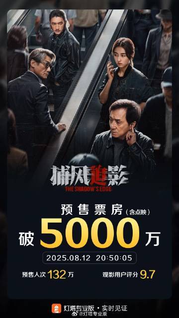 据灯塔专业版实时数据,截至8月12日20时50分,影片《捕风追影》点映及预售总票房突破5000万,彰显超高人气,预示正式上映后票房潜力。