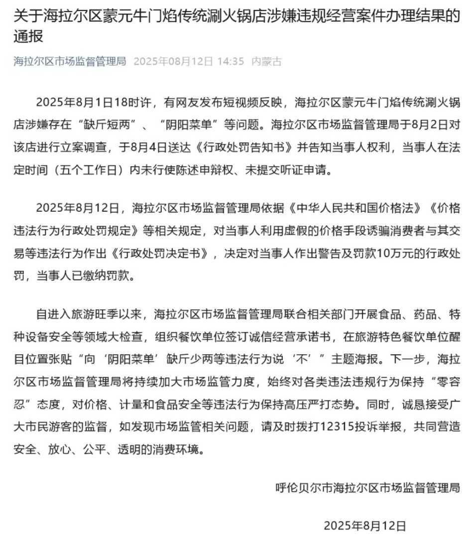 2025年8月1日18时许,有网友发布短视频反映,海拉尔区蒙元牛门焰传统涮火锅店涉嫌存在“缺斤短两”、“阴阳菜单”等问题。海拉尔区市场监督管理局于8月2日对该店进行立案调查,于8月4日送达《行政处罚告知书》并告知当事人权利,当事人在法定时间(五个工作日)内未行使陈述申辩权、未提交听证申请。2025年8月12日,海拉尔区市场监督管理局依据《中华人民共和国价格法》《价格违法行为行政处罚规定》等相关规定,对当事人利用虚假的价格手段诱骗消费者与其交易等违法行为作出《行政处罚决定书》,决定对当事人作出警告及罚款10万元的行政处罚,当事人已缴纳罚款。自进入旅游旺季以来,海拉尔区市场监督管理局联合相关部门开展食品、药品、特种设备安全等领域大检查,组织餐饮单位签订诚信经营承诺书,在旅游特色餐饮单位醒目位置张贴“向‘阴阳菜单’缺斤少两等违法行为说‘不’”主题海报。下一步,海拉尔区市场监督管理局将持续加大市场监管力度,始终对各类违法违规行为保持“零容忍”态度,对价格、计量和食品安全等违法行为保持高压严打态势。同时,诚恳接受广大市民游客的监督,如发现市场监管相关问题,请及时拨打12315投诉举报,共同营造安全、放心、公平、透明的消费环境。