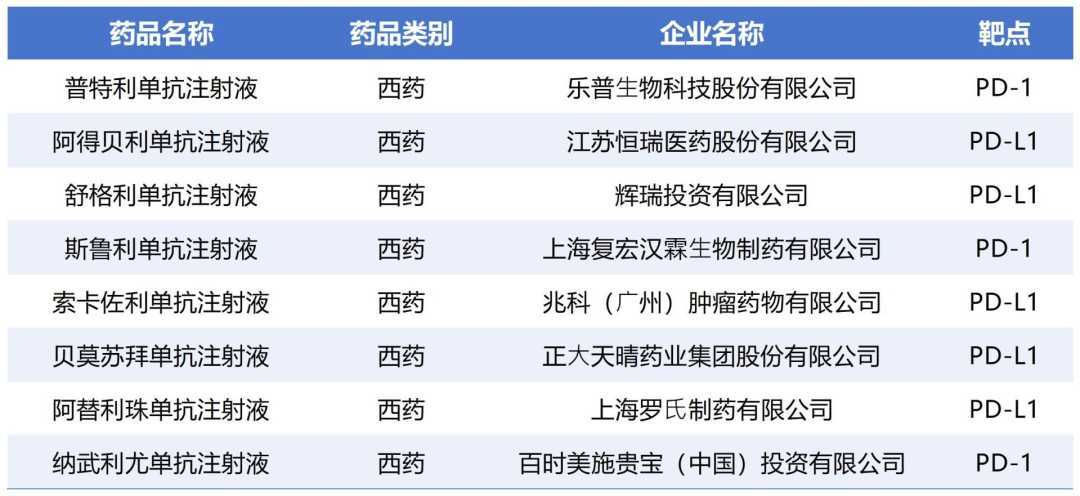 从药品种类看,以单抗注射液为代表的靶向药物是申报的主力军。其中,PD-(L)1单抗的申报数量最多,涉及国内上市公司包括乐普生物、恒瑞医药、复宏汉霖、中国生物制药。另外,来自吉利德、辉瑞和安斯泰来的3款ADC药物(抗体偶联药物)也通过了初步审查。