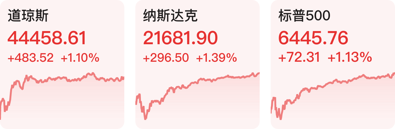 美股三大指数均涨超1%,纳指涨1.39%,标普500指数涨1.13%,道指涨1.1%,均创历史新高。大型科技股普涨,热门中概股多数上涨,腾讯音乐涨近12%。