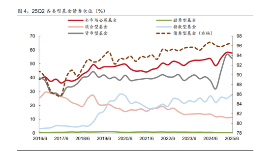 2025Q2全市场公募基金债券仓位小幅下降,货币型基金持债占比降幅最大,指数型基金持债占比环比增加。