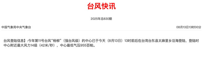 据中央气象台消息,今年第11号台风“杨柳”(强台风级)的中心已于今天(8月13日)13时前后在台湾台东县太麻里乡沿海登陆,登陆时中心附近最大风力14级(42米/秒),中心最低气压955百帕。此次台风登陆对沿海地区可能产生较大影响,相关部门需做好防范措施。