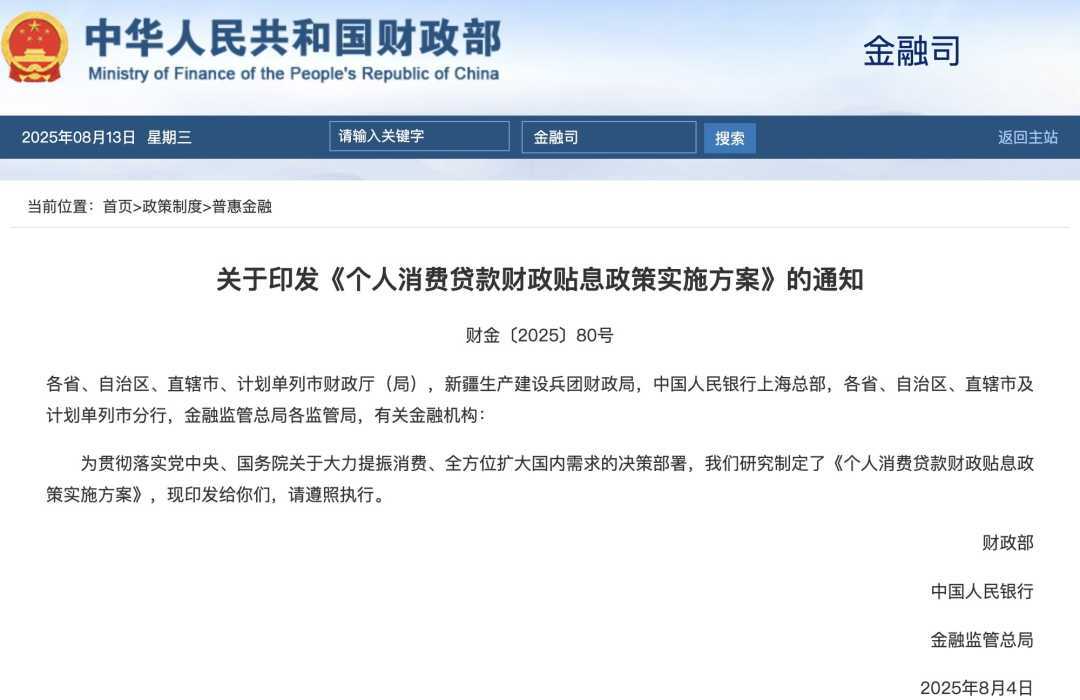 8月12日,财政部、中国人民银行、金融监管总局印发《个人消费贷款财政贴息政策实施方案》(下称《方案》),明确对符合条件的个人消费贷款给予财政贴息。