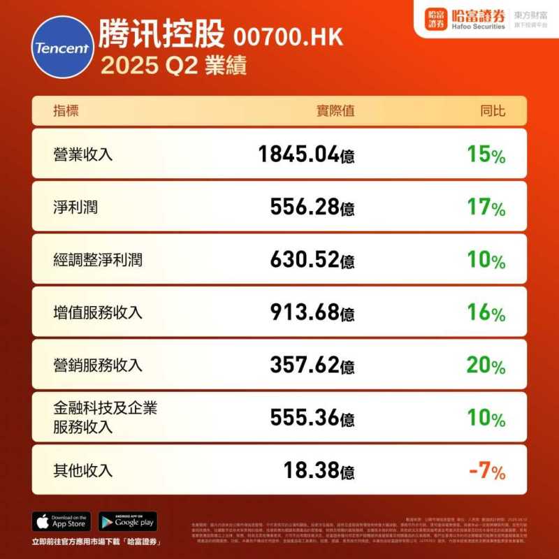 数据披露,在AI驱动下,腾讯第二季度增值服务收入同比增长16%至913.7亿元,游戏板块收入同比增长22%,其中国际游戏市场收入同比增长35%至188亿元,连续四个季度创新高;营销服务在大模型技术升级和微信生态活跃度提升带动下保持高速增长,收入同比增长20%至357.6亿元;金融科技及企业服务业务盈利明显改善,收入同比增长10%至555.4亿元。