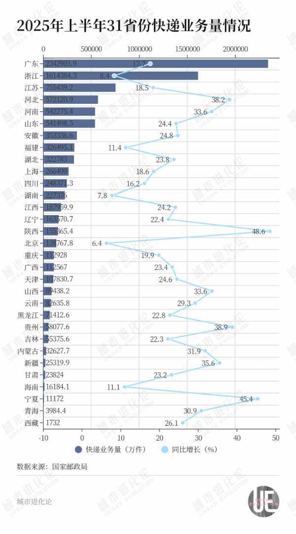 这趟班列连接新疆和陕西,已成为近两年快递业的“增长极”。今年上半年,陕西快递业务量增长48.6%至约15.5亿件,增速高居全国第一,新疆也增长35.6%至约2.5亿件,增速位居第五。