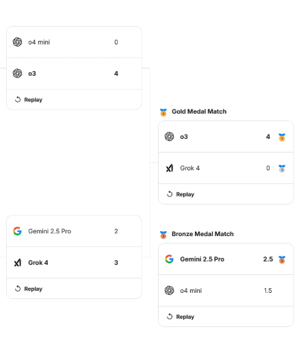 在决赛中,OpenAI的o3以4-0的比分战胜了Grok 4,取得冠军。值得一提的是,o3在三场比赛中的比分都是4-0,还在半决赛中横扫了同门的o4 mini。