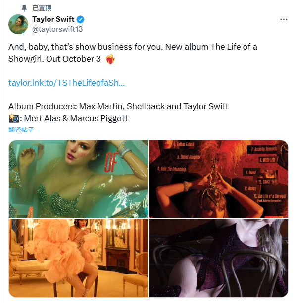 泰勒·斯威夫特公开了第12张专辑《The Life of a Showgirl》的封面图,并宣布专辑将于10月3日全球发行,引发乐迷热烈期待。