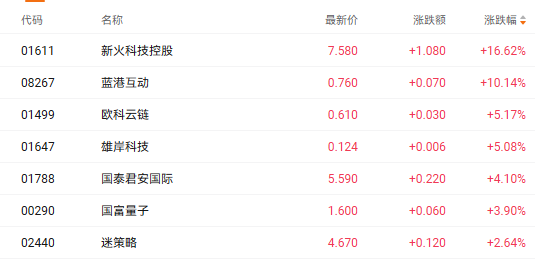 截至发稿,新火科技控股(01611.HK)涨16.62%、蓝港互动(08267.HK)涨10.14%、欧科云链(01499.HK)涨5.18%。