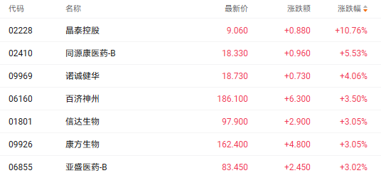 受益于市场利好,港股医药股持续走强。截至发稿,晶泰控股(02228.HK)、同源康医药-B(02410.HK)、诺诚健华(09969.HK)、百济神州(06160.HK)分别上涨10.76%、5.53%、4.06%、3.50%。