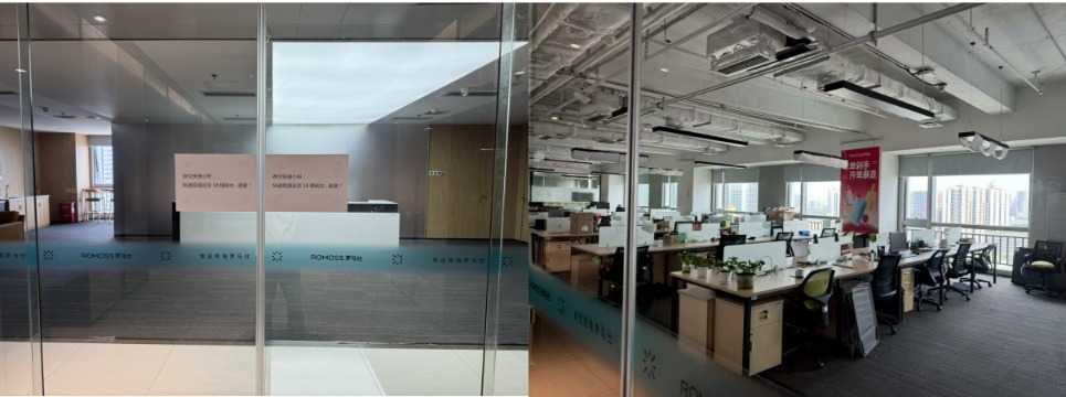 蓝鲸科技记者在现场看到,昔日接待外客的16层大门紧闭,空无一人,门上仅贴着“快递请送至18楼前台”的提示。步入17层,开放式办公空间内,电脑、绿植仍整齐地摆放在工位上,但无人办公。唯有18层,记者发现有大约十多名员工仍在处理事务。