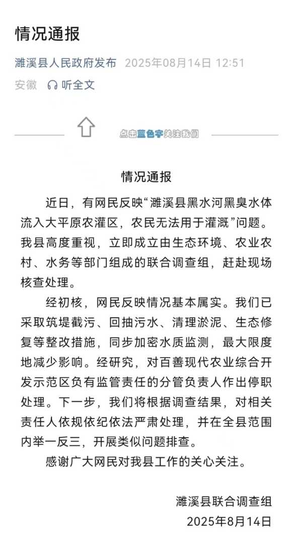 央视新闻报道,安徽省濉溪县黑水河黑臭水体流入农灌区,影响农民灌溉。当地已成立联合调查组,采取整改措施,并对相关责任人作出停职处理,将依法严肃追责。