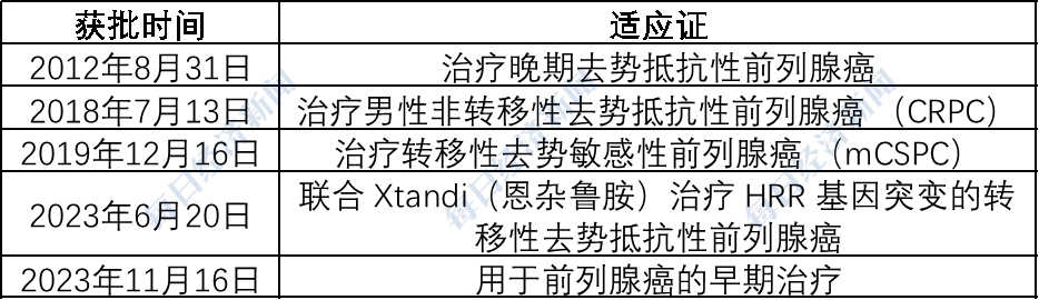 恩扎卢胺深耕前列腺癌,目前已有5个适应证获批据公开资料制图