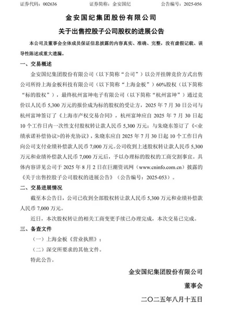 公告显示,7月30日,金安国纪与杭州富坤签订了《上海市产权交易合同》,杭州富坤应在2025年7月30日起10个工作日内一次性支付股权转让款人民币5300万元。与此同时,金安国纪还与上海金板的股东朱晓东签订了《<业绩承诺补偿协议>的补充协议》,朱晓东需在2025年7月30日起的10个工作日内向公司支付业绩补偿款7000万元。截至公告日,金安国纪已收到全部股权转让款5300万元及业绩补偿款7000万元。