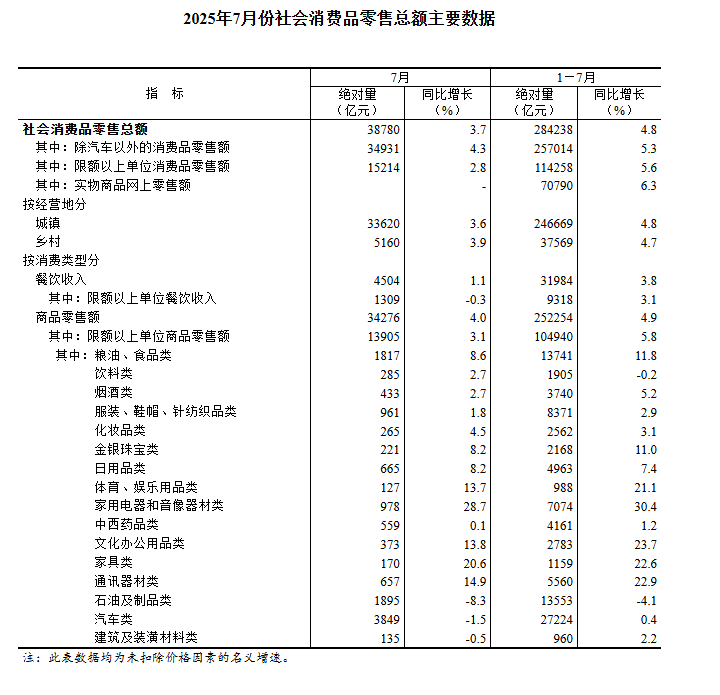7月份,社会消费品零售总额38780亿元,同比增长3.7%。其中,除汽车以外的消费品零售额34931亿元,增长4.3%。1—7月份,社会消费品零售总额284238亿元,增长4.8%。其中,除汽车以外的消费品零售额257014亿元,增长5.3%,消费增长趋势持续。