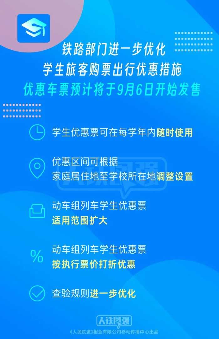 相关优惠车票预计将于9月6日开始发售,请学生旅客通过铁路12306网站、客户端、微信等渠道查询,或关注各地铁路部门发布的动态信息。