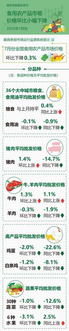 据商务部监测,7月全国食用农产品市场价格环比下降0.3%,粮食、食用油、猪肉等价格涨跌互现,反映市场供需变化,备受关注。