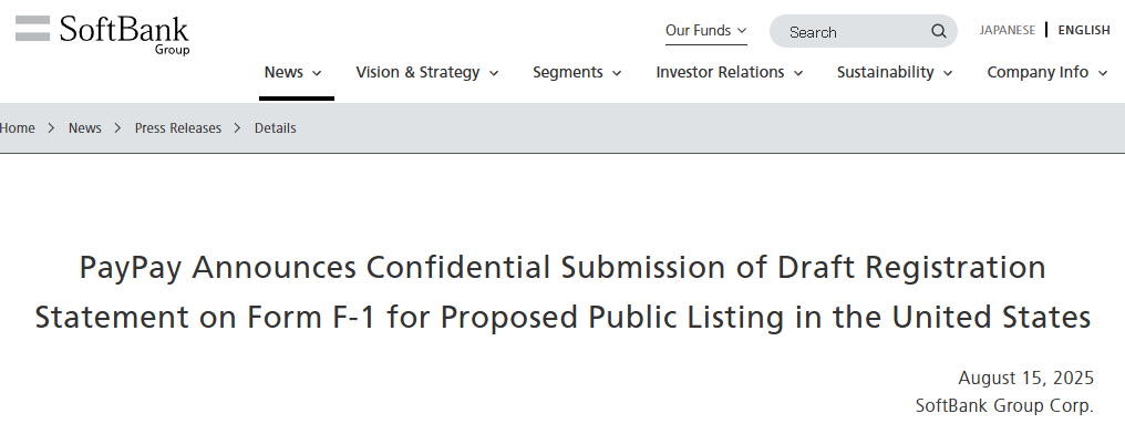 当地时间周五(8月15日),软银在官网宣布,PayPay Corporation前一天已向美国提交了F-1表格,申请发行美国存托股份(ADS),但“公开上市的具体时间表、规模和发行价格尚未确定”。